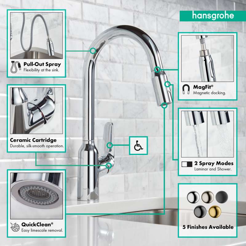 Timeless design and quality in your kitchen with the Focus N modern design that blends harmoniously into any kitchen. The large handle design offers great ease of use and can also be operated safely with soapy hands. Thanks to the high-quality mounting components, the installation of your new faucet is simple and safe. The tested connection hoses are flexible and temperature-resistant. QuickClean technology cleans the kitchen faucet quickly and MagFit keeps the hand spray safe and secure in the faucet spout. Backed by a limited lifetime warranty for piece of mind.