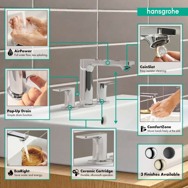 Quality that suits your style: Rebris E 3-hole bathroom faucet with pop-up drain. With its timeless, sleek design, the Rebris E 3-hole bathroom faucet 110 with pop-up drain will visibly enhance your bathroom. The sleek shapes and precise surfaces create an atmosphere of well-being. Rebris S includes modern designer faucets at a fair price. Make your own dream bathroom a reality. The 3-hole bathroom faucet interprets the classic operating concept in a surprisingly new and modern way with two wing handles. The renowned hansgrohe quality brings the promises of a winning design to life: Water volume and temperature are controlled with the two wing handles via high-quality ceramic valves. They function smoothly and reliably even after frequent use. Thanks to innovative hansgrohe technology, the tap helps to save water too: even at high water pressure the max. flow is 1.2 GPM. For a full water jet, the tap enriches the water with air (AirPower). This creates a soft jet that sprays less - meet the beauty of water. A pop-up drain is included. It allows the waste plug to be easily controlled using one hand. The aerator can be removed for cleaning and descaled using a coin. No tools needed. This keeps the faucet looking like new.