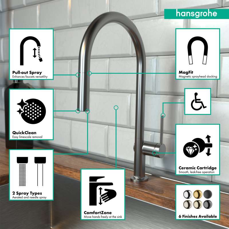 • Magnetic holder: the pull-out shower head is held securely and in the middle of the spout (hansgrohe MagFit)