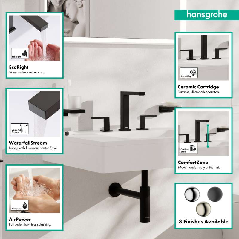 The Tecturis E 150 widespread faucet turns water into an experience. Give water a striking shape with the compact Tecturis E 150 bathroom faucet from hansgrohe. Tecturis E impresses with a purist design that has clear lines and geometric shapes. At the same time, the bathroom faucet combines an attractive appearance with maximum comfort. This turns the use of water into a new aesthetic experience every day. The water is enriched with air, giving fewer water splashes and an incomparably pleasant feeling on the skin.