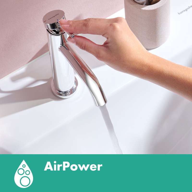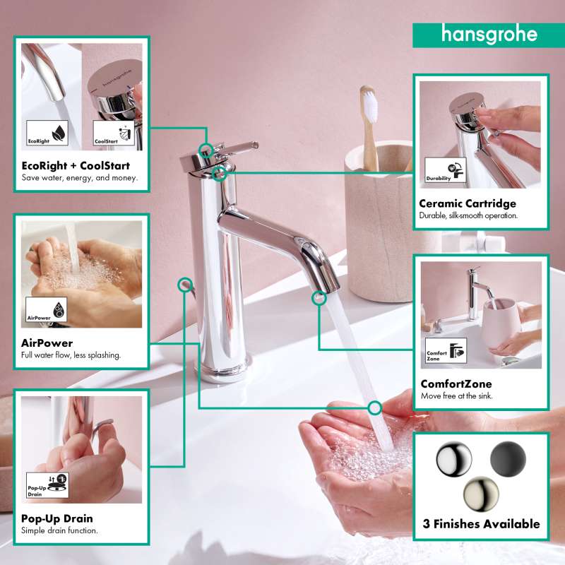 The Tecturis S 110 single lever faucet with CoolStart and drain assembly turns water into an experience. Give water a striking shape with the compact Tecturis S 110 CoolStart bathroom faucet from hansgrohe. Tecturis S impresses with a purist design that has clear lines and rounded shapes. At the same time, the bathroom faucet combines an attractive appearance with maximum comfort. This turns the use of water into a new aesthetic experience every day. The water is enriched with air, giving fewer water splashes and an incomparably pleasant feeling on the skin. The extra wide spray looks like a small waterfall and suits the cubic design well (WaterfallStream). When the lever is in the middle position, only cold water flows. If it is deliberately turned left, hot water is added (CoolStart).