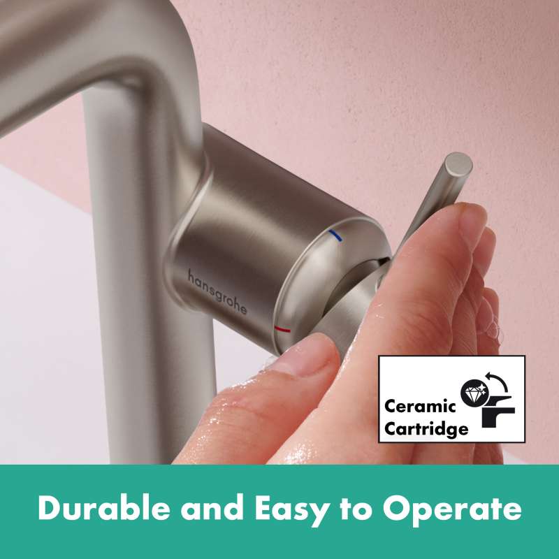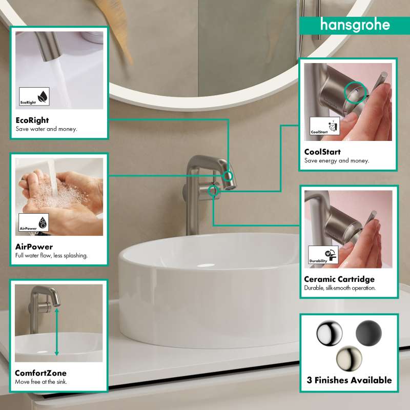 The Tecturis S 240 Fine single lever faucet turns water into an experience. Give water a striking shape with the compact Tecturis S 240 Fine CoolStart bathroom faucet from hansgrohe. Tecturis S impresses with a purist design that has clear lines and rounded shapes. At the same time, the bathroom faucet combines an attractive appearance with maximum comfort. This turns the use of water into a new aesthetic experience every day. Convenient: the lever placement reduces water drops and limescale on the faucet. The water is enriched with air, giving fewer water splashes and an incomparably pleasant feeling on the skin.