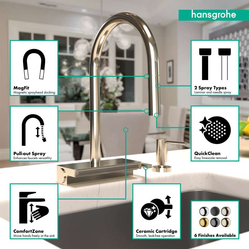 The striking high arc spout stands out and emphasises the synergy between angles and curves. The adjustment on the pull-out spout guarantees the spray type that's right for your project. Simply switch between the laminar and shower spray using the lockable button. With the Select function on the faucet's base, a simple touch of a button is all it takes to switch to the flat, gentle vegetable shower. The faucet also features a single-lever handle on the side for turning the water on and off and controlling the temperature. The included sBox makes it easy to pull out the hose, which is safely retracted and stored under the sink after use. The high arc spout boasts a radius that can be set to prevent it swivelling beyond the sink.