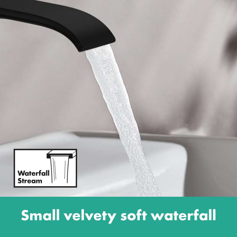 For feel-good moments: Elegant single-lever faucet with extra wide water jet. The Vivenis single-lever bathroom faucet 110 transforms time at the sink into a ritual of well-being. The gentle stream of Water flows like a small waterfall from the extra wide spout and creates a completely new feeling of water (WaterfallStream). Air-enriched drops wet hands and face softly. In combination with the elegantly curved design of the faucet and the excellent workmanship in proven hansgrohe quality, the bathroom becomes a place of rest. Details such as the reduced handle design and the lever that is opposite to the hand make it clear: at hansgrohe people are at the center of attention. The handle has no play even after frequent use and controls the high-quality ceramic mixing system from hansgrohe. With a distance of 4.3 in between spout and bathroom sink, the single-lever faucet offers plenty of freedom of movement (ComfortZone 110). The expressive surface in matte black is Easy to clean and remains permanently beautiful.