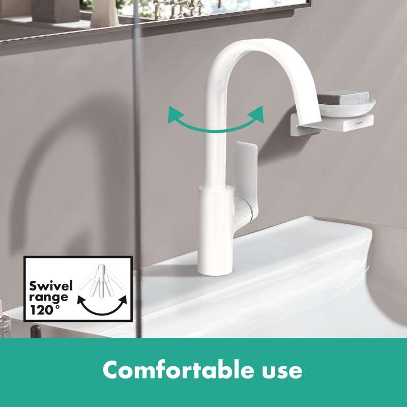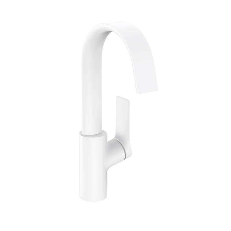 For feel-good moments: Elegant faucet with extra wide water jet. The Vivenis single-lever bathroom faucet transforms time at the sink into a ritual of well-being. The gentle stream of water flows like a small waterfall from the extra wide spout and creates a completely new feeling of water (WaterfallStream). Air-enriched drops wet hands and face softly. In combination with the elegantly curved design of the spout and the excellent workmanship in proven hansgrohe quality, the bathroom becomes a place of rest. Details such as the reduced handle design and the lever that is opposite to the hand make it clear: at hansgrohe people are at the center of attention. The handle has no play even after frequent use and controls the high-quality ceramic mixing system from hansgrohe. With a comfortable distance between spout and bathroom sink, the faucet offers plenty of freedom of movement. The expressive surface in matte white is easy to clean and remains permanently beautiful.