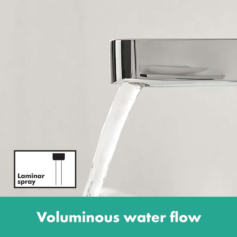 Modern 3-hole faucet in brushed nickel for a puristic bathroom ambience - includes push-open drain The Finoris 110 3-hole bathroom faucet in brushed nickel with push-open drain assembly from hansgrohe interprets the classic operating concept surprisingly new and modern via two wing handles. The slim, geometric shapes fit particularly well into a puristic bathroom ambience. There, the faucet sets an expressive accent with its easy-to-clean surface in brushed nickel. The high quality faucet keeps what the elegant design promises. The two wing handles control high-quality ceramic valves from hansgrohe. The amount and temperature of the water are reliably adjusted. The quiet and crystal clear laminar spray continues the slim fitting body and forms a harmonious unit. Thanks to hansgrohe EcoRight technology, the faucet helps save water. It uses a maximum of 1.2 GPM - even at high water pressure. The sink is the heart of the bathroom. Here, the high spout simplifies with approx. 4 in. distance from the aink for many everyday tasks (ComfortZone 110). Whether it is filling large vessels or washing hair quickly under the faucet, the Finoris 3-hole bathroom faucet 110 supports confidently. Push-open drain included. The included push-open drain fitting is operated without a pull rod. A short finger pressure on the drain plug opens or closes the valve. Without the pull rod on the back, the faucet looks even more puristic.