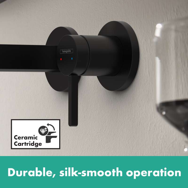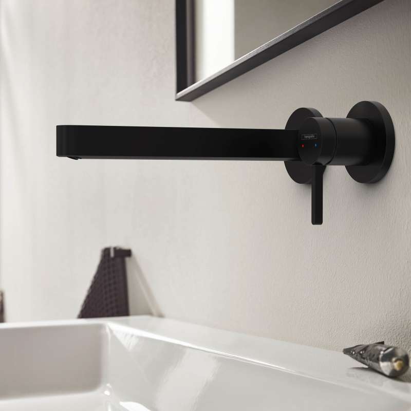 Slim design single lever mixer faucet for wall mounting The Finoris 2-hole wall-mounted bathroom faucet from hansgrohe stands out: thanks to its sleek, geometric shape and clever Installation in the wall. This creates more space around the sink and can also be combined well with a free-standing vessel sink. The minimalist design sets an expressive accent in the bathroom with the brilliant, Easy-to-clean surface in matte black. The high quality faucet keeps what the elegant shape promises. The pin handle controls a smooth-running ceramic mixing system from hansgrohe. It reliably regulates water quantity and temperature with one hand. The quiet and crystal clear laminar spray continues the slim fitting body and forms a harmonious unit. Thanks to hansgrohe EcoRight technology, the fuacet designr is particularly water-saving. It uses a maximum of 1.2 GPM - even at high water pressure. Drain fitting included. The included non-locking drain fitting is used for sinks and washbasins without overflow. It prevents water from overflowing. More flexibility in bathroom design: the handle can be placed either on the right or left. Depending on how the base body is mounted in the wall.