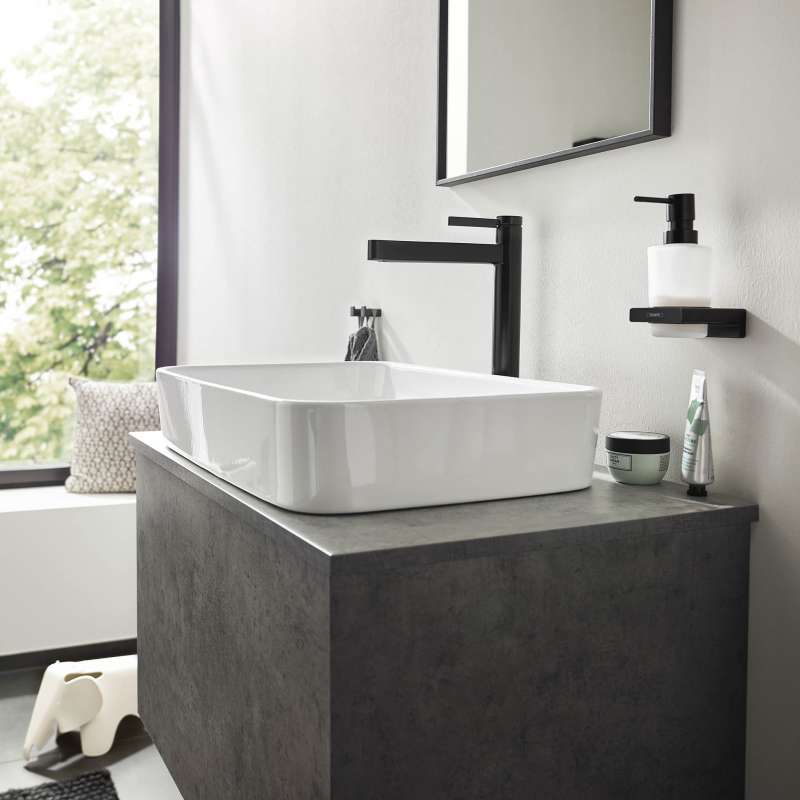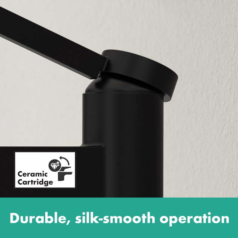 Modern single-hole faucet in matte black for a puristic bathroom ambience - includes push-open drain The Finoris 260 single-hole bathroom faucet in matte black with push-open drain assembly from hansgrohe interprets the classic operating concept surprisingly new and modern via a slim single handle. The slim, geometric shapes fit particularly well into a puristic bathroom ambience. There, the faucet sets an expressive accent with its easy-to-clean surface in matte black. The high quality faucet keeps what the elegant design promises. The single handle controls a high-quality ceramic valve from hansgrohe. The amount and temperature of the water are reliably adjusted. The quiet and crystal clear laminar spray continues the slim fitting body and forms a harmonious unit. Thanks to hansgrohe EcoRight technology, the faucet helps save water. It uses a maximum of 1.2 GPM - even at high water pressure. The sink is the heart of the bathroom. Here, the high spout simplifies with approx. 10 in. distance from the aink for many everyday tasks (ComfortZone 260). Whether it is filling large vessels or washing hair quickly under the faucet, the Finoris single-hole bathroom faucet 260 supports confidently. Push-open drain included. The included push-open drain fitting is operated without a pull rod. A short finger pressure on the drain plug opens or closes the valve. Without the pull rod on the back, the faucet looks even more puristic.