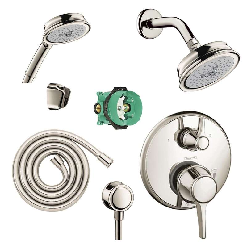• Includes showerhead, thermostatic trim with diverter and rough, handheld shower, holder, wall outlet, 63-in hose, and 6-in shower arm with flange