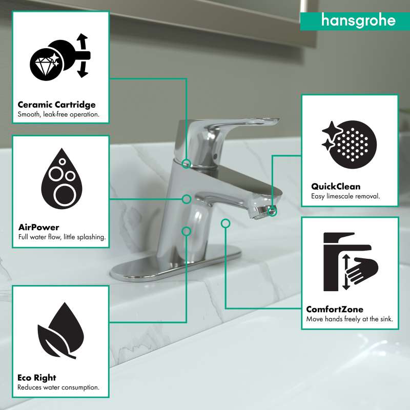 This harmoniously designed, durable and visually strong bathroom faucet from the Focus line combines all hansgrohe quality features in one product: in shiny chrome, with a dynamic silhouette and gentle curves, the faucet features three extremely practical hansgrohe technologies: EcoSmart, QuickClean and AirPower. This harmoniously designed, durable and visually strong bathoom faucet from the Focus line combines all hansgrohe quality features into one product: in shiny chrome, with a dynamic silhouette and gentle curves, the faucet features three useful hansgrohe technologies. The single handle controls a high-quality ceramic valve from hansgrohe. The amount and temperature of the water are reliably adjusted. The soft air-infused spray continues the slim fitting body and forms a harmonious unit. Thanks to hansgrohe EcoRight technology, the faucet helps save water. It uses a maximum of 1.2 GPM - even at high water pressure