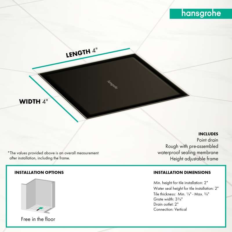 • Suitable Installation: The hansgrohe RainDrain system is suitable for 2" outlets in new contruction and renovation