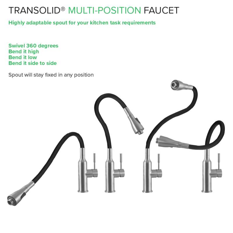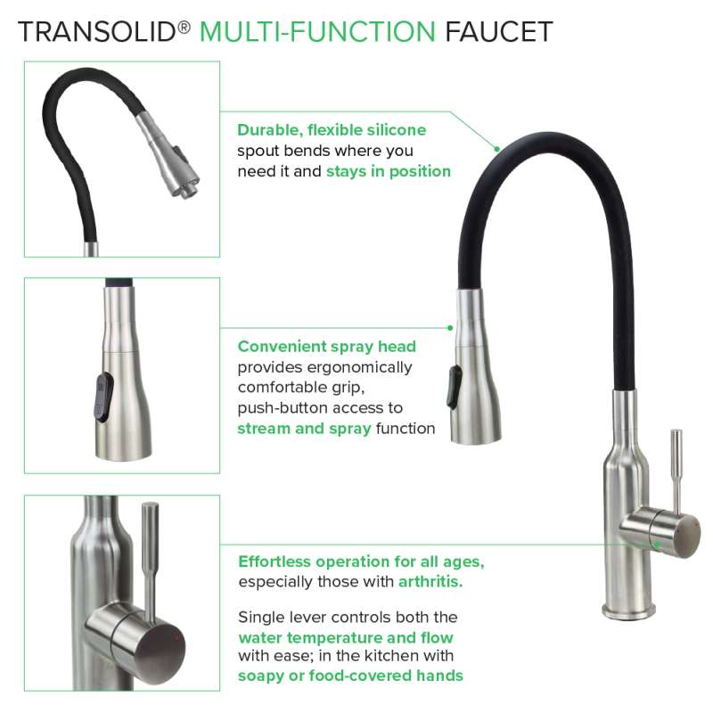 The all-new Transolid PF7509A Faucet combines beauty, functionality, and innovation- creating the perfect combination for your kitchen or laundry room! This Transolid faucet features a stainless steel body with a brushed nickel finish and a modern black silicone-covered high-arc spout; its versatile style will blend seamlessly into any design. Design style aside, this faucet is also a breeze to use! The single-lever handle controls the water temperature and water pressure while the simple spray head button switches between the stream and spray function with ease. The high-arc neck swivels 360 degrees to reach every corner of the sink, and it is ultra-flexible, with the ability to bend and hold any position- making it the perfect tool to tackle big messes!