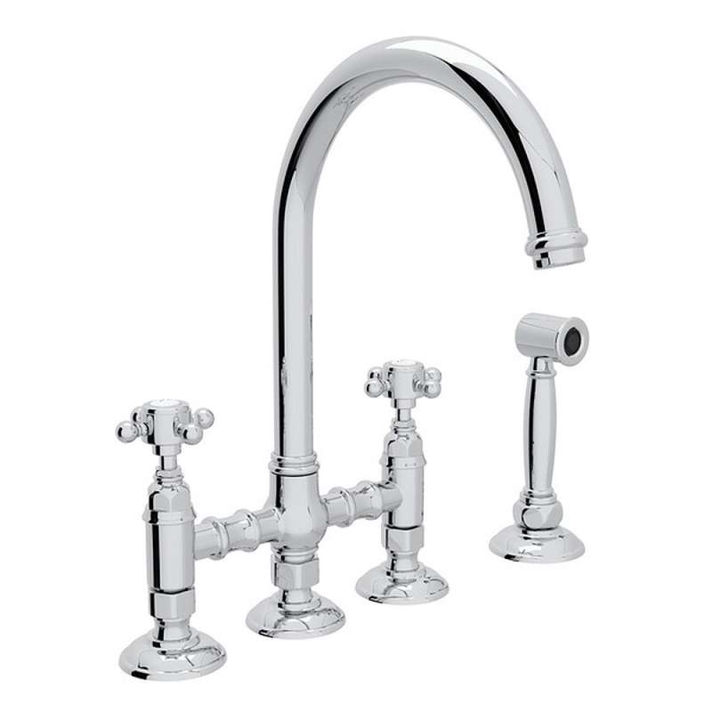 Deck Mount C-Spout 3 Leg Bridge Kitchen Faucet With Sidespray And Cross Handle