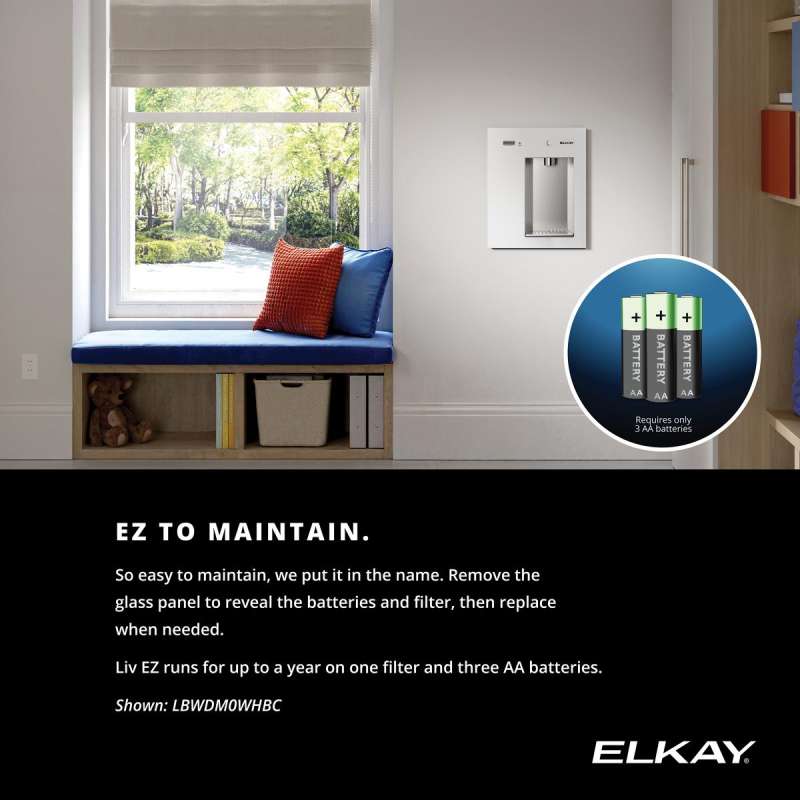 Elkay's Liv EZ filtered water dispenser for homes redefines convenience with its user-friendly design and hassle-free installation. Liv EZ(TM) is a residential bottle filler that dispenses cleaner, safer water with the included PFAS filter, which is tested and certified to NSF/ANSI standards to reduce harmful "forever chemicals," known as PFOA/PFOS, as well as lead, microplastics and other contaminants. Although the dispenser is equipped with water filtration, it does not require an electric hookup, but only 3 AA batteries to operate, for added convenience. Its simple design and operation make installation a breeze, and its low-profile design keeps it tucked into the wall and out of the way. However, its stunning design is one you'll want to show off to guests. From enjoying a cleaner cup of coffee to feeding pets and houseplants quality water, the possibilities are endless with Elkay's Liv EZ(TM) water dispenser.