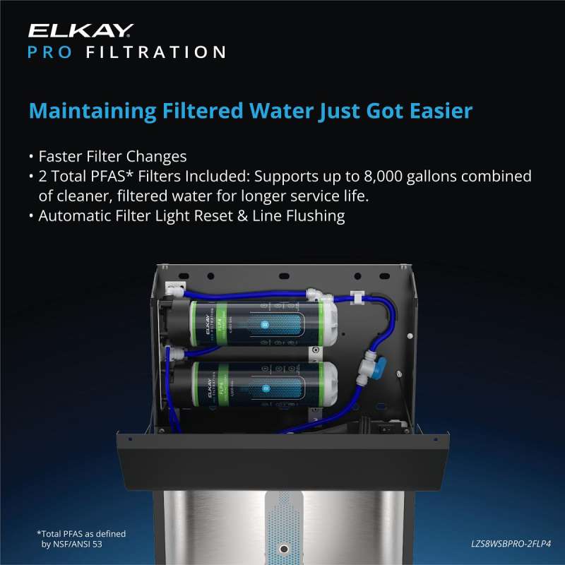 • 2 Total PFAS* Filters Included: Elkay Pro Filtration 4,000-gallon filters are tested and certified to NSF/ANSI 42, 53 and 401 to reduce Total PFAS, lead, microplastics and more (*Total PFAS as defined by NSF/ANSI 53)