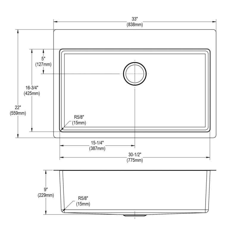 Countertop Cutout Dimensions 32-3/8" x 21-3/8" (822mm x 543mm) with 1/2" (12mm) corner radius
