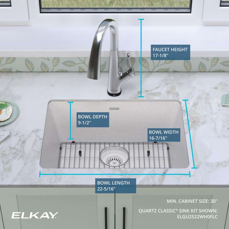 • KIT INCLUDES: ELGU2522WH0 sink, LKAV7051FCR faucet with filter included, LKOBG2217SS bottom grid, LKQS35WH drain; conveniently packaged together to save you time