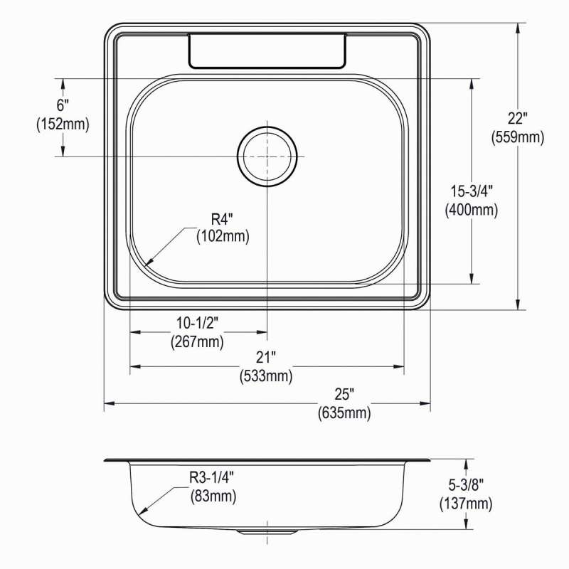 Stainless Steel Sink 25" X 22" X 5-3/8" Drop-In Single Bowl 22 Gauge 2-Hole, MFV1072 Satin