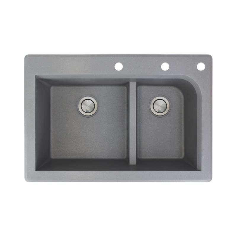• 33-in X 22-in X 9.5-in silQ Granite Kitchen Sink with 1-3/4 J-Shaped Double Offset Bowls, Drop-in Installation, with 3 CEF Faucet Holes, In Grey Grey