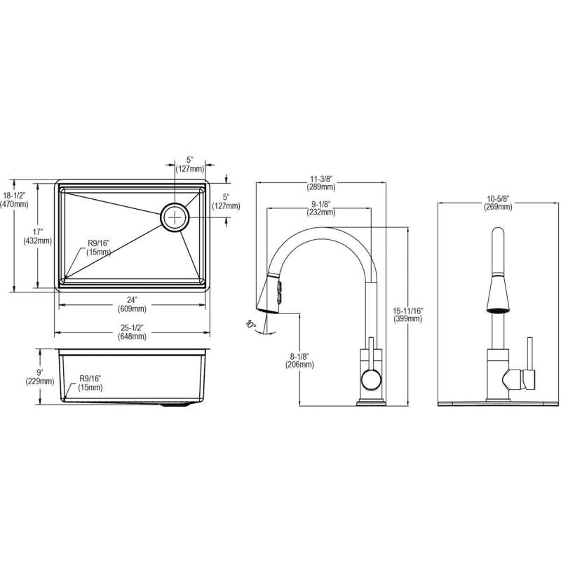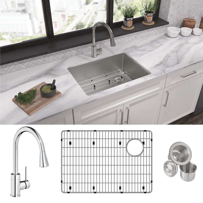 Crosstown 18 Gauge Stainless Steel 25-1/2" X 18-1/2" X 9" Single Bowl Undermount Sink & Faucet Kit With Bottom Grid & Drain, ECTRU24179RTFBC