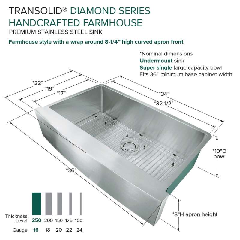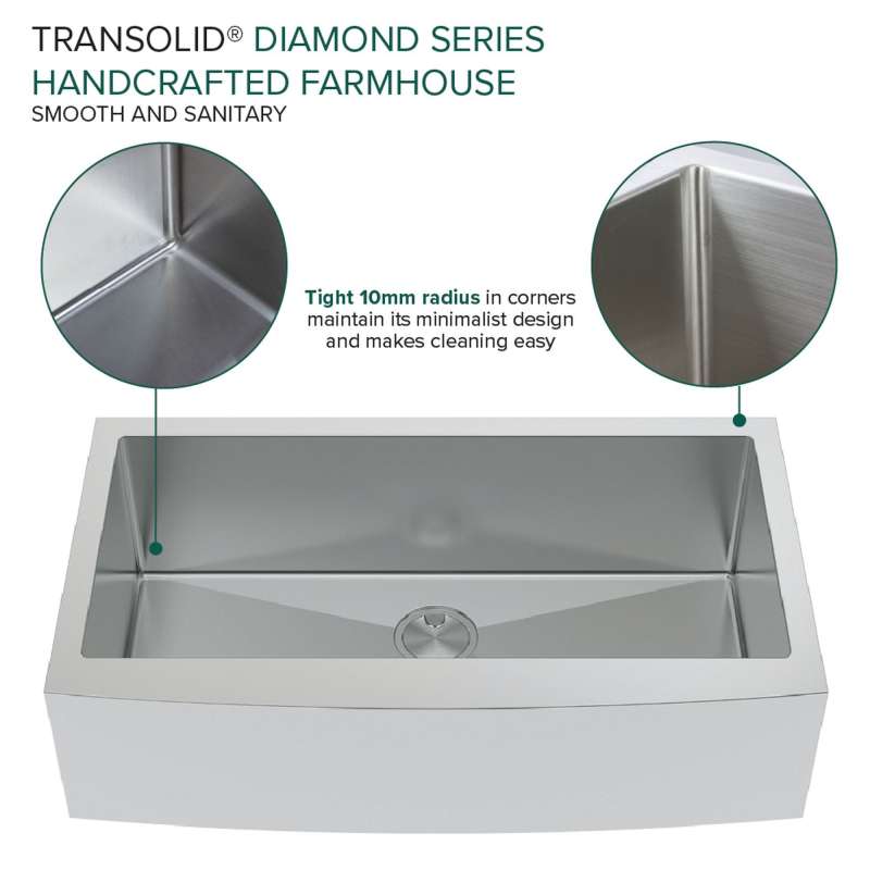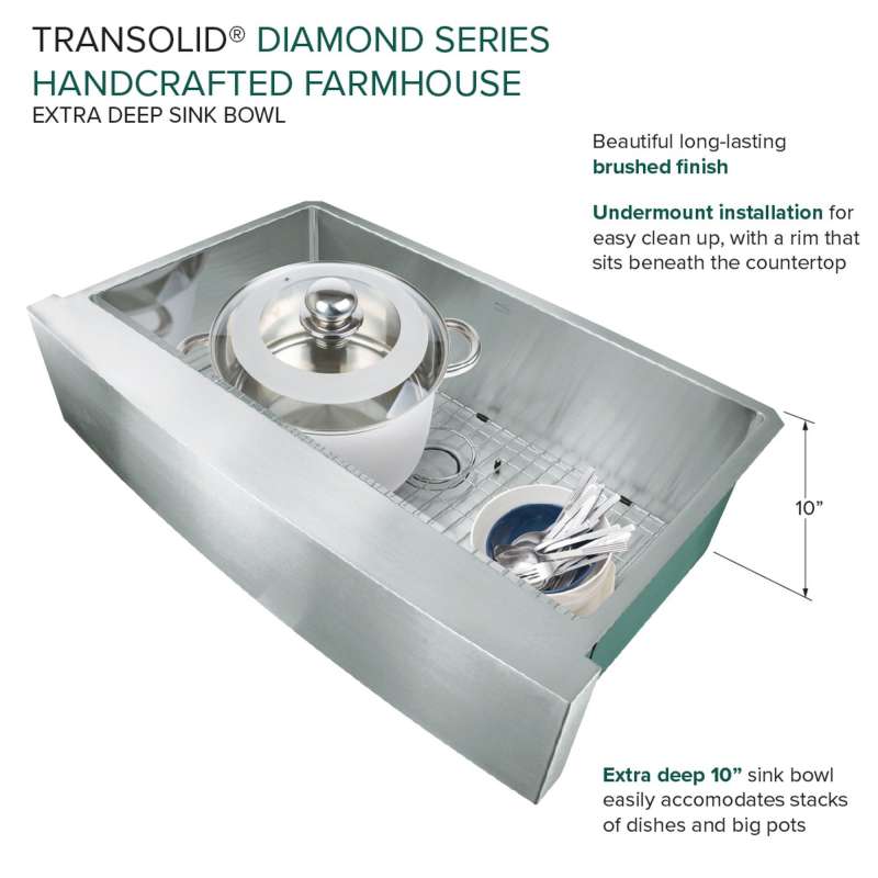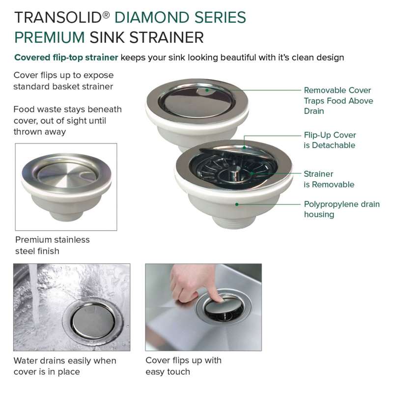 With the Transolid Diamond Sink Collection you can experience the beauty and functionality of a commercial kitchen at a fraction of the cost. Crafted from industrial 304 stainless steel with substantial 16-gauge thickness, which is 2.5 times heavier than similar size sinks available in the market, these luxurious sinks are known for their appeal, durability, and corrosion resistance. The deep 10 in. basins feature channeled grooves along the sink bottom and tight 3/8 in. radius interior corners that work to keep the water moving towards the drain. The underside of the sinks include thick 5 mm sound deadening pads and waterproof undercoating to keep your kitchen quiet and free from unwanted condensation. Included with every Transolid Diamond Sink is a universal sink drain kit with standard 1-1/2 inch pipe fittings, a magnetic accessories kit consisting of a hook, ledge, and sponge holder, which can easily adhere to the side of the sink by applying the included magnetic tape along the underside. A matching stainless steel sink grid with rubber bumpers to keep your sink protected from scratches and a sleek stainless covered flip-top sink strainer are also included. The long-lasting brushed finish sink and included accessories will compliment any kitchen and provide a true sense of culinary excellence. Transolid Diamond Sinks are all backed by a lifetime limited warranty.