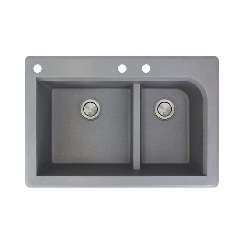 • 33-in X 22-in X 9.5-in silQ Granite Kitchen Sink with 1-3/4 J-Shaped Double Offset Bowls, Drop-in Installation, with 3 CAD Faucet Holes, In Grey Grey
