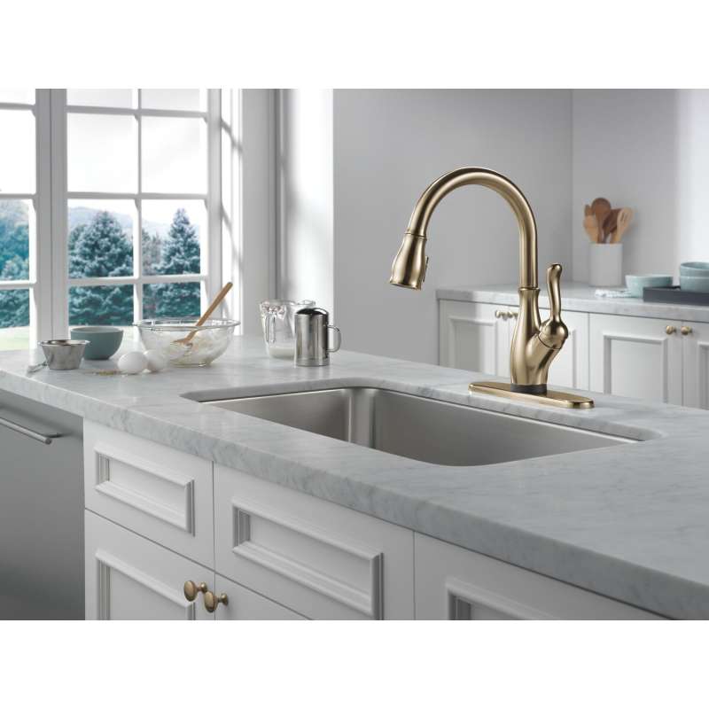 Delta voiceiq technology pairs with your connected home device to give you exactly the amount of water you need with features like metered dispensing and custom container commands. Simply ask your faucet to dispense one cup, six ounces, a gallon or just about any other amount you could need. Custom container commands make everyday tasks easier, like filling a coffee pot or dog bowl, while thoughtful features like water warm-up and voice-activated on/off lend a hand when yours are full. This leland pull-down kitchen faucet is packed with functional features, like touch2o technology. A simple touch anywhere on the spout or handle with your wrist or forearm activates the flow of water at the temperature where your handle is set. The tempsense led light changes color to alert you to the water’s temperature and eliminates any possible surprises or discomfort. Shieldspray technology cleans with laser-like precision while containing mess and splatter. A concentrated jet powers away stubborn messes while an innovative shield of water contains splatter and clears off the mess, so you can spend less time soaking, scrubbing and shirt swapping. You can install with confidence, knowing that delta kitchen faucets are backed by our lifetime limited warranty.