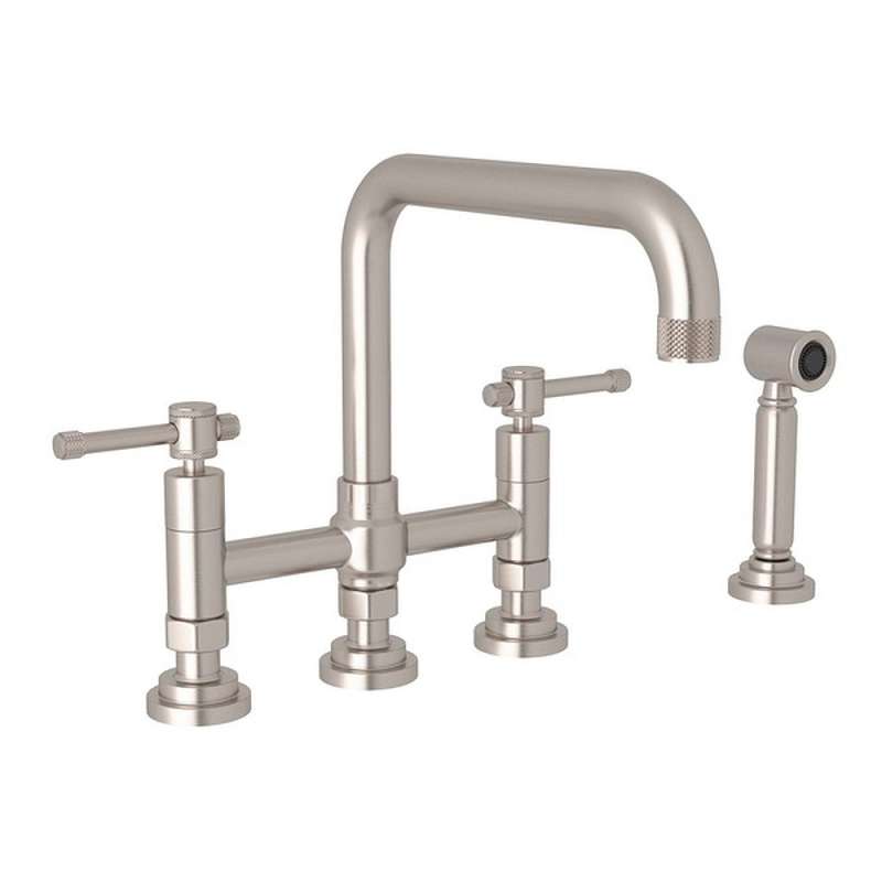 Deck Mount U-Spout 3 Leg Bridge Kitchen Faucet With Sidespray With Industrial Metal Lever Handle In Satin Nickel Satin Nickel