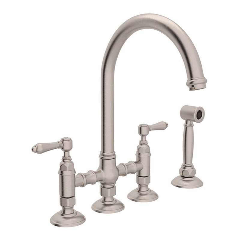Deck Mount C-Spout 3 Leg Bridge Kitchen Faucet With Sidespray And Metal Lever In Satin Nickel Satin Nickel