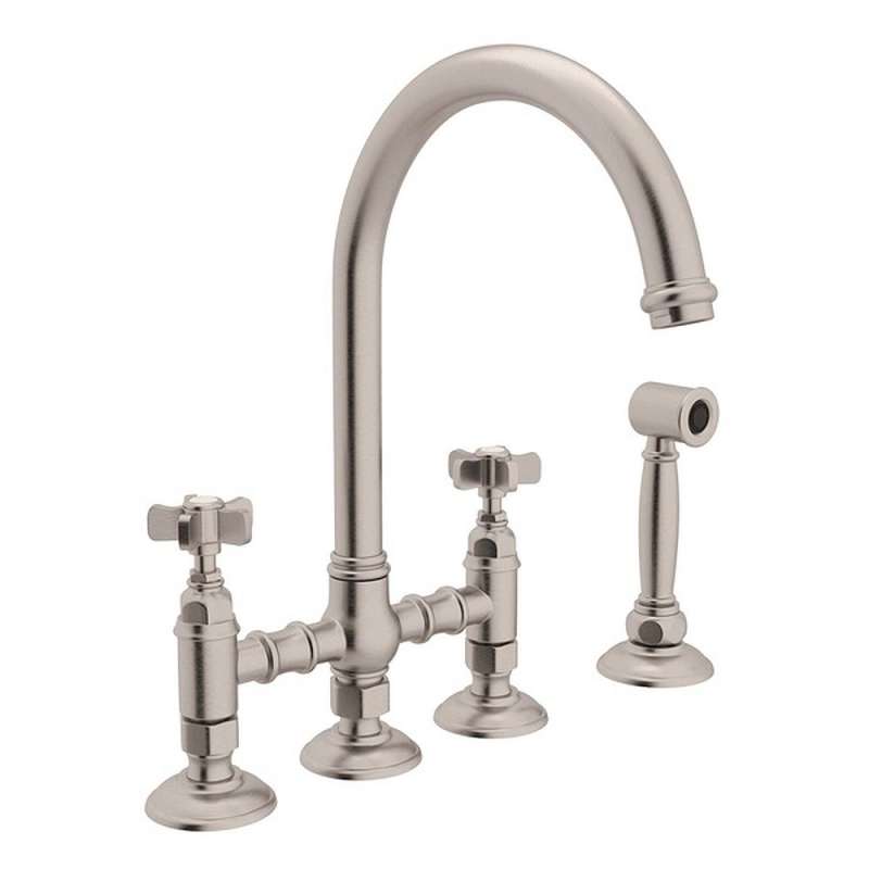 Deck Mount C-Spout 3 Leg Bridge Kitchen Faucet With Sidespray And Five Spoke Handles Sidespray In Satin Nickel Satin Nickel