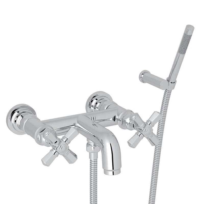 • Wall Mount Exposed Tub Set with Cross Handle Handshower in Polished Chrome Polished Chrome