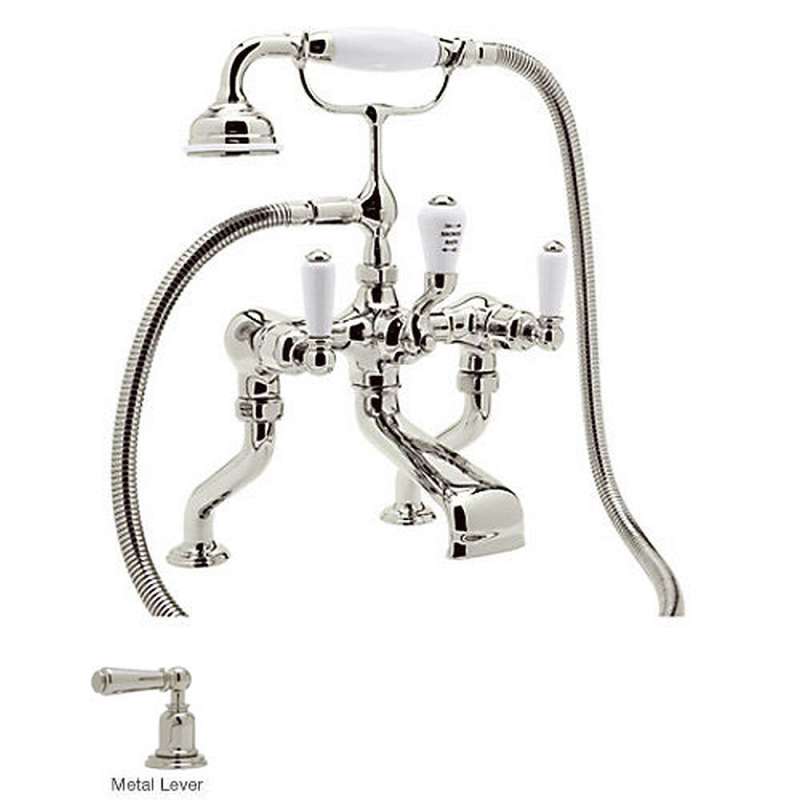 • Perrin and Rowe Deck Mount Exposed Tub Filler Faucet with Hand Shower, Hand Shower Cradle, Hose, Extended Pillar Unions, and Metal Lever Handles