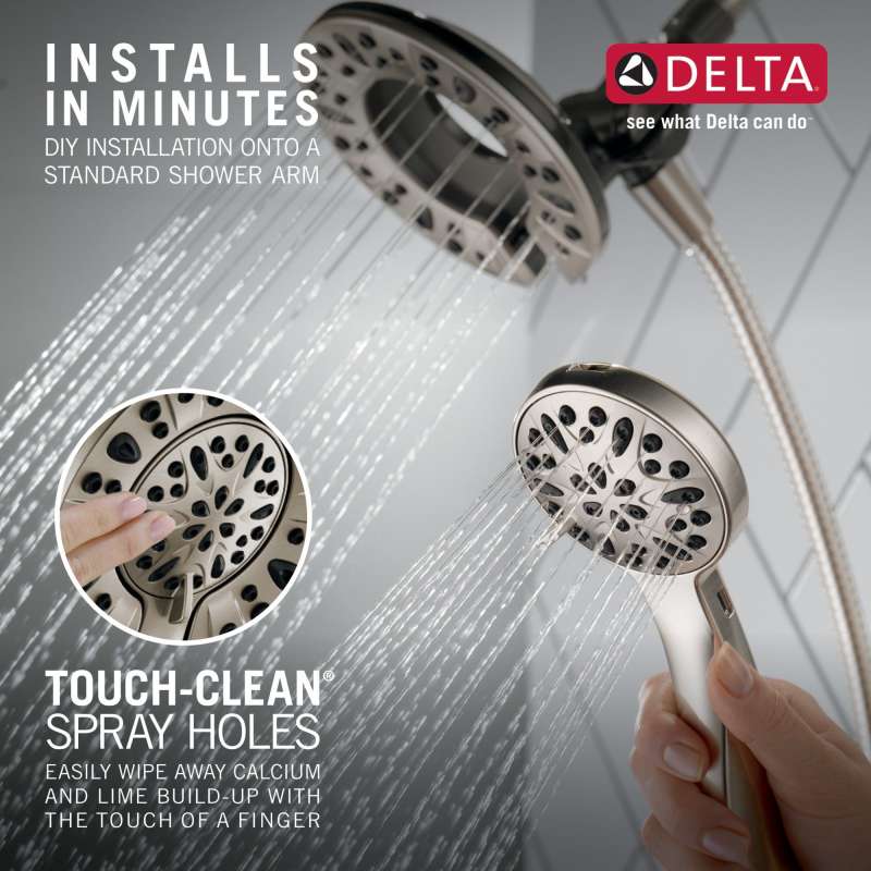 The Delta In2ition Two-in-One Shower features a detachable hand shower which can be used separately from or simultaneously with the shower head. This integrated dual-functionality gives you maximum flexibility without sacrificing warmth, as you can choose to have water streaming from the shower head only, the hand shower only or both the shower head and hand shower at once. While other products may gather unsightly mineral buildup over time, Delta soft, rubber Touch-Clean spray holes allow any mineral residue to simply be wiped away for an instantly refreshed look — with no need for soaking or the aid of chemical cleaners. Delta WaterSense labeled showers use at least 20% less water than the industry standard — helping you save water without compromising performance. You can install with confidence, knowing that Delta showers are backed by our Lifetime Limited Warranty.
