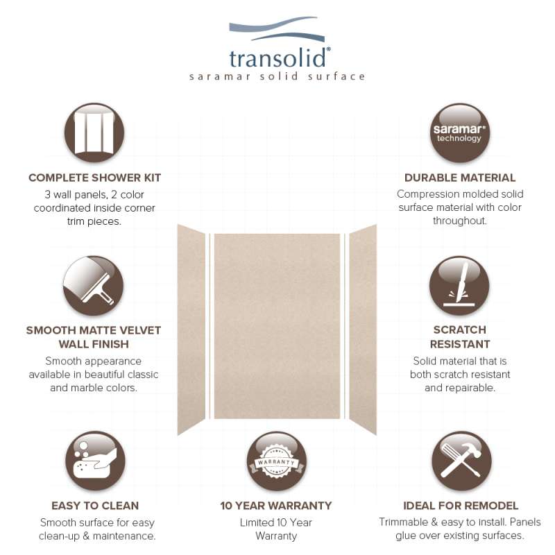 Transolid SaraMar bath and shower wall panels in Velvet finish are characterized by a smooth, matte finish, which offers a unique and modern element that can quickly elevate the design of your bathroom. These walls are ideal for a quick remodel, because there is no messy demolition required, instead, SaraMar walls simply glue right over your existing surface. All Transolid shower walls are backed by a hassle-free 10-year warranty. SaraMar walls are easy-to-clean, durable, and resistant to stain; they work with new and existing construction, they are trimmable to fit any space, and are on trend with the latest colors and patterns. Discover whether these bathroom wall panels are the right choice for you!