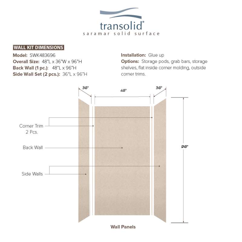 • SWK483696-28V SaraMar 48-in x 36-in x 96-in Glue to Wall 3-Piece Shower Wall Trimmable Kit, Cashew Velvet Cashew Velvet