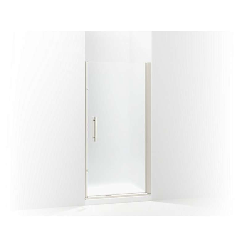 The Finesse Peak frameless swinging door offers minimal metal framing around the glass to showcase the bathing space. The headerless design allows for easy entry.
