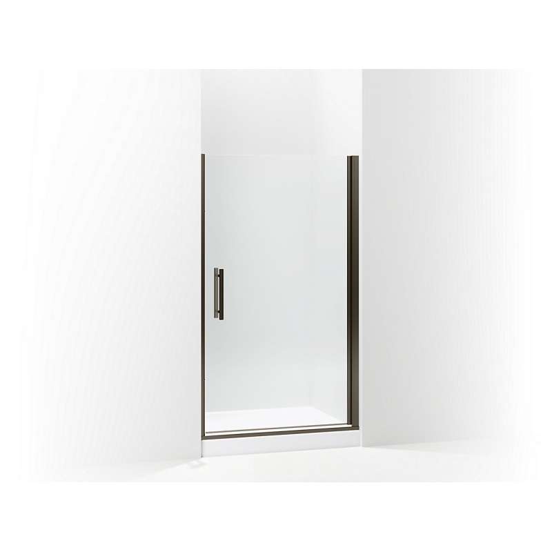 The Finesse Peak frameless swinging door offers minimal metal framing around the glass to showcase the bathing space. The headerless design allows for easy entry.