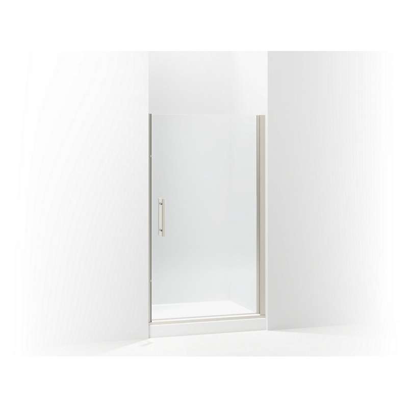 The Finesse Peak frameless swinging door offers minimal metal framing around the glass to showcase the bathing space. The headerless design allows for easy entry.