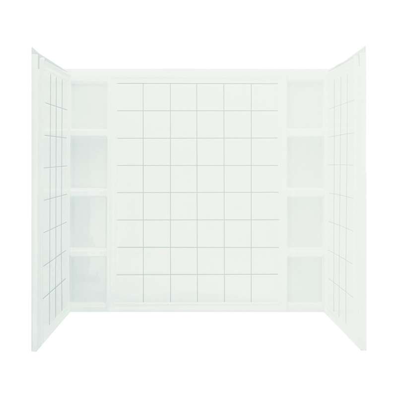Kit includes bathtub, back wall, end walls, bath/shower door, drain, installation kit