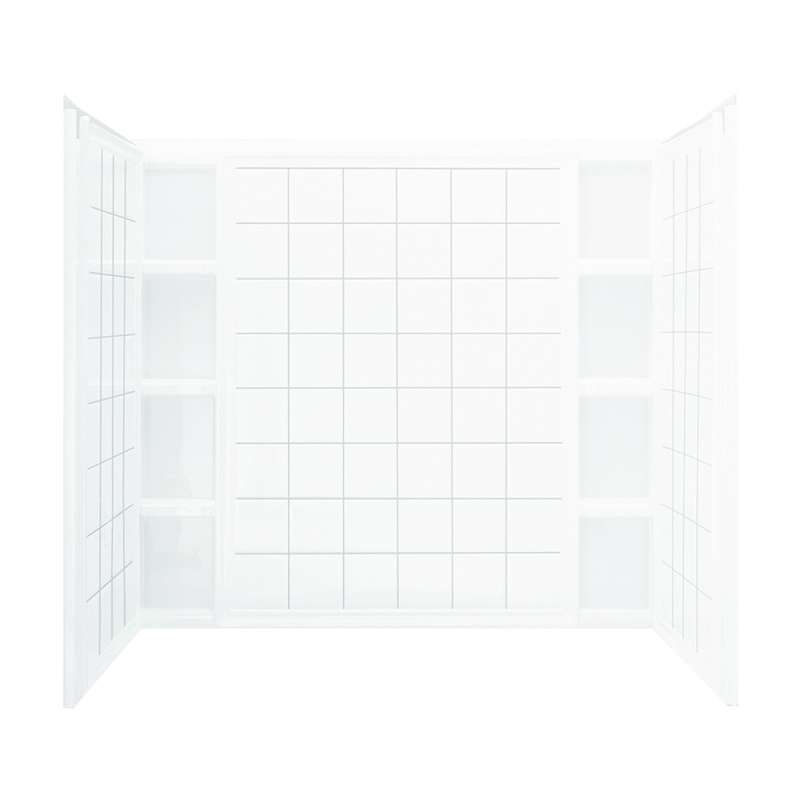 Kit includes bathtub, back wall, end walls, bath/shower door, drain, installation kit