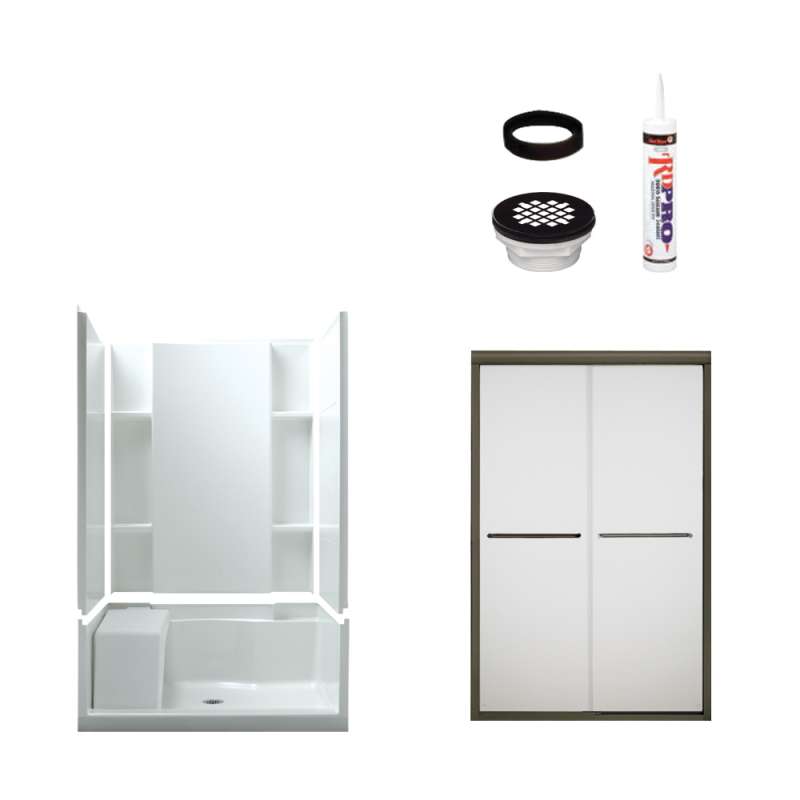 Shower base, back wall, end walls, door, drain kit