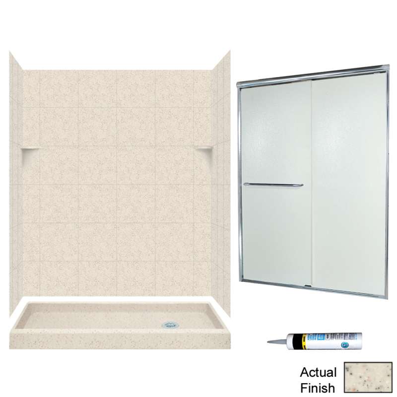 • Kit includes shower door, 2 side panels, back wall panel, 2 corner soap dishes, shower base, and drain cover