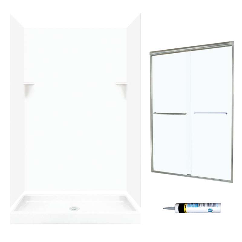• Kit includes shower door, 2 side panels, back wall panel, 2 corner molding strips, 2 corner soap dishes, shower base, and drain cover