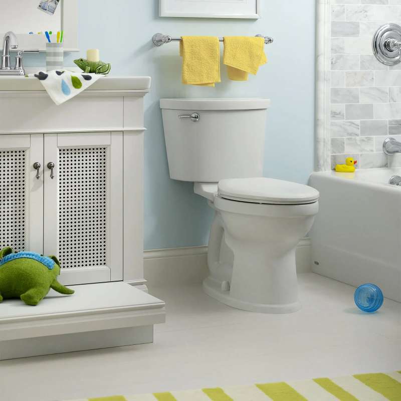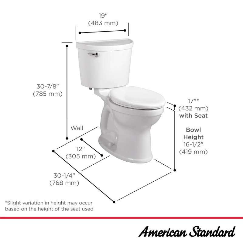 The Champion PRO Chair-Height Elongated Toilet from American Standard has been engineered and proven to flush a bucket of golf balls in a single flush, ensuring dependable performance every time. The Champion PRO toilet features a PowerWash(R) rim to scrub the bowl with every flush, and an EverClean(R) antimicrobial surface to protect against mold, mildew, odor- and stain-causing bacteria. Comfortable, chair-height design is 17" tall, including seat (sold separately), with elongated front for added room. This low-flow toilet uses just 1.6 gallons per flush to help save water, and is backed by an industry-leading warranty.