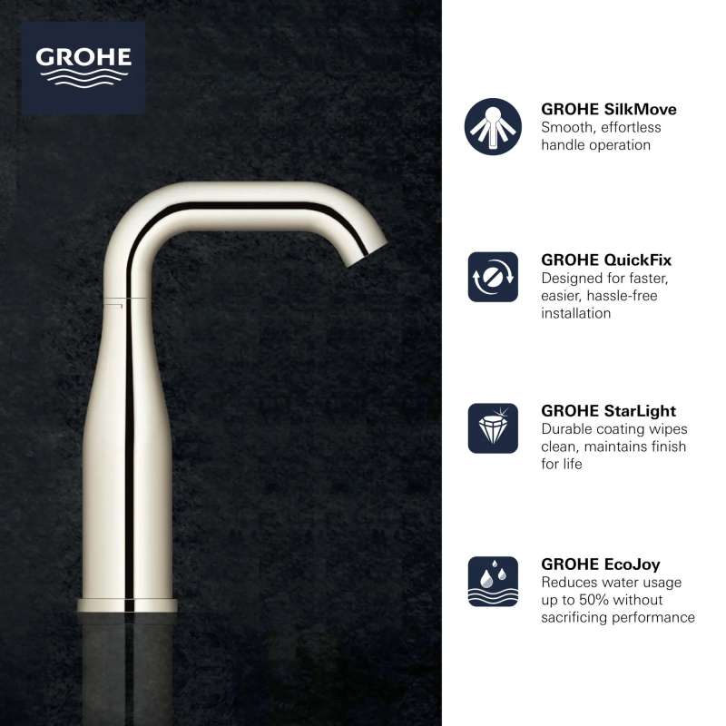Sleek and sophisticated, the GROHE Essence Single-Handle Single-Hole Bathroom Faucet is a distinctive style with a gently curved swivel spout and side lever handle. This water-saving faucet reduces water usage while providing superior performance. Available in an array of exquisite, on-trend finishes. The Essence single-handle bathroom faucet embodies all the elements of precision craftsmanship and design excellence.