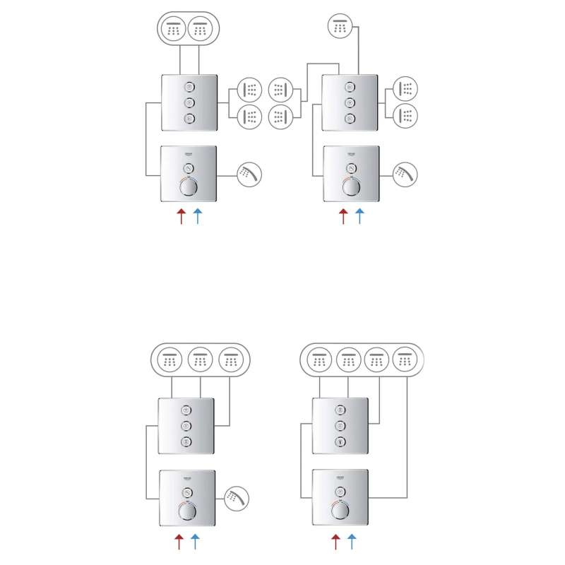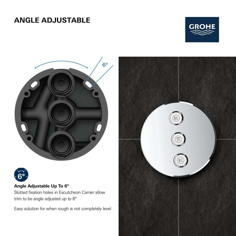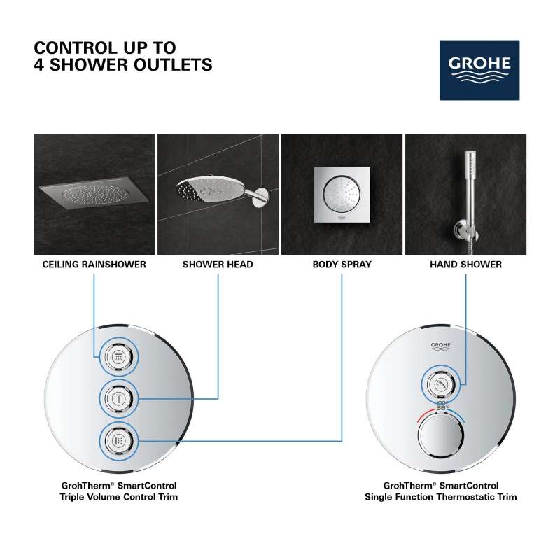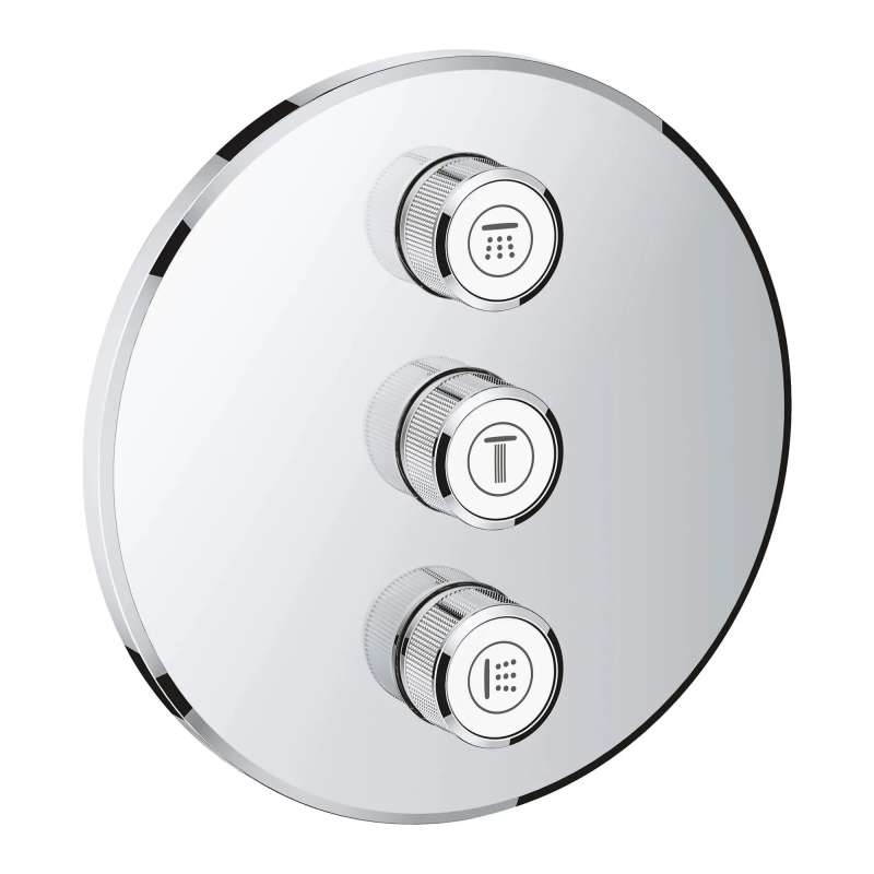 Let the Grohtherm SmartControl triple volume control trim bring flexibility and clever control to your shower or bath Control your bath or shower with ease, using a simple push-turn action, with as many options as you have water outlets - bath, shower, hand shower, even side showers can be controlled via the neat Grohtherm SmartControl trim set. Combined with the Grohtherm SmartControl thermostat with one valve (29136000) this trim set gives you total freedom of choice: you can control up to four outlets for your ideal shower or bath configuration, giving you more choices of spray and water source selection and combination. Innovative SmartControl technology allows you to select your desired spray source and adjust the water volume at the push-turn of a button. GROHE EasyLogic markings and textured buttons with exchangeable symbols make it easy and intuitive to use. Thanks to the GROHE QuickFix system it's Swift and straightforward to install. The slim profile makes it easy to keep clean, and the stylish and durable GROHE StarLight chrome finish will look pristine for years to come. With a slim, square design perfect for that minimalist, streamlined look, this product is bound to enhance your bathroom scheme. Please note that this product must be installed in combination with the GROHE Rapido SmartBox (35601000) and Grohtherm SmartControl thermostat for concealed installation with one valve (29136000).