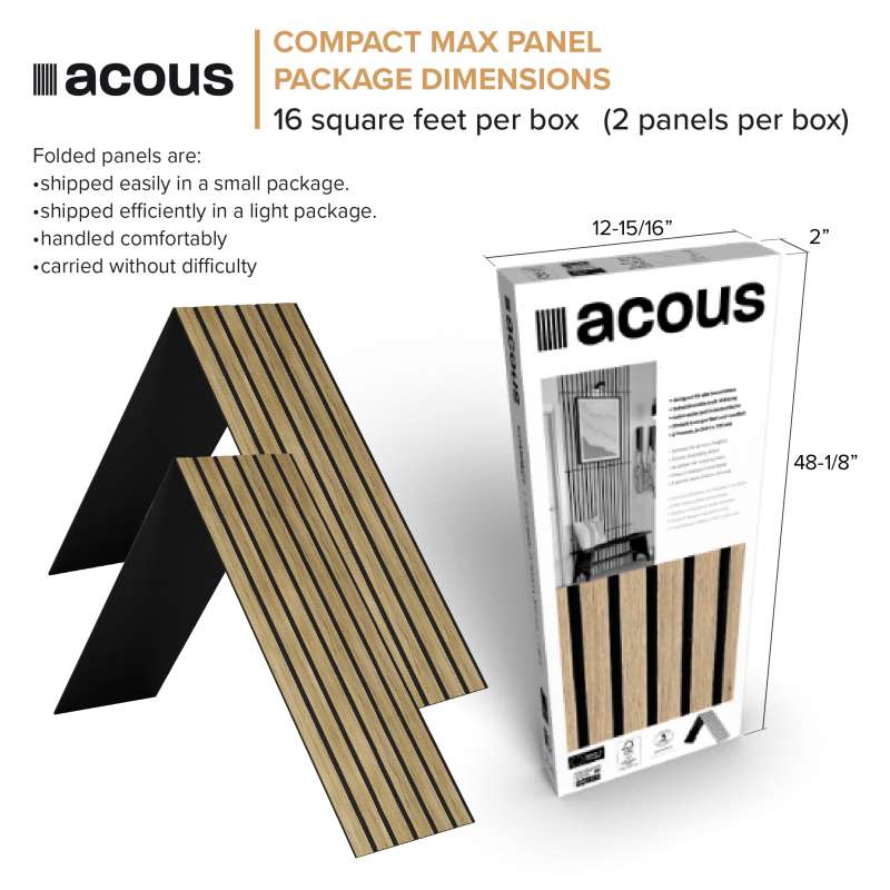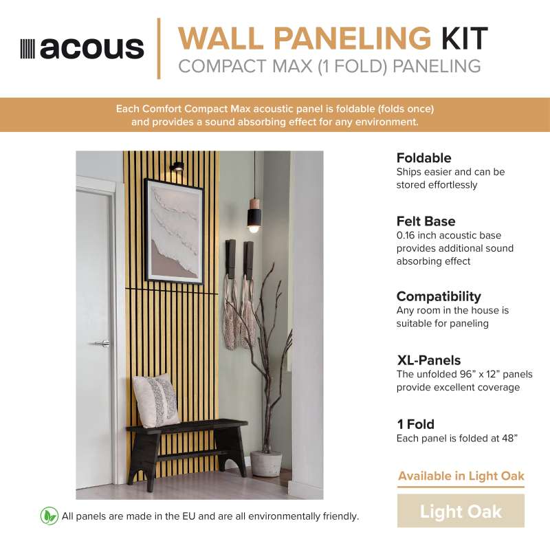 Adorn your walls with Acous Compact Max panels that feature a single fold for ease of shipping and maneuverability. This fold also offers a stylish and modern design aspect with horizonal slats once installed. Constructed to stand at 96 inches high, these panels will perfectly cover walls of 8 feet with no visible seams in between each panel. Crafted from premium brushed real oak, these panels are FSC-certified (C017145), ensuring sustainability.