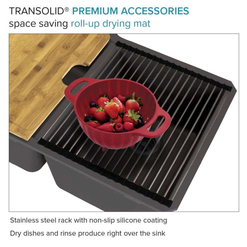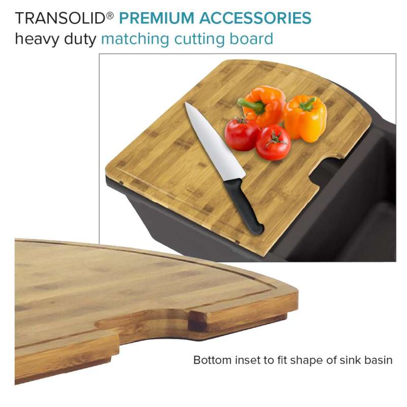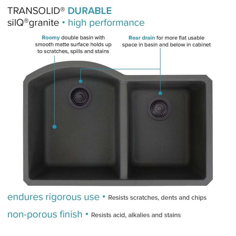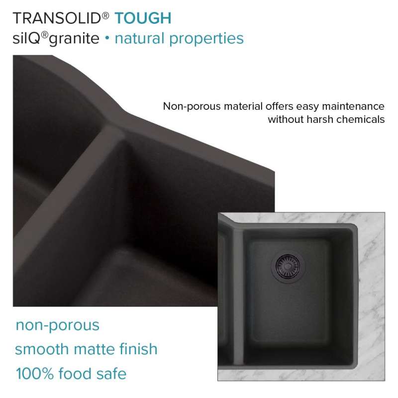 Transolid silQ® granite sinks are made with the union of natural granite and acrylic resin. The result gives Transolid sinks resistance to high temperatures, scratches, dents and chips, as well as impacts and violent shocks. The non-porous 100% food-safe surface grants you peace of mind and reduces the need for cleaning with harsh chemicals. Say goodbye to endless hours of shopping and say hello to pre-matched accessories that will make your sink the perfect multi-functional workspace. Covered by Transolid's lifetime limited residential warranty.