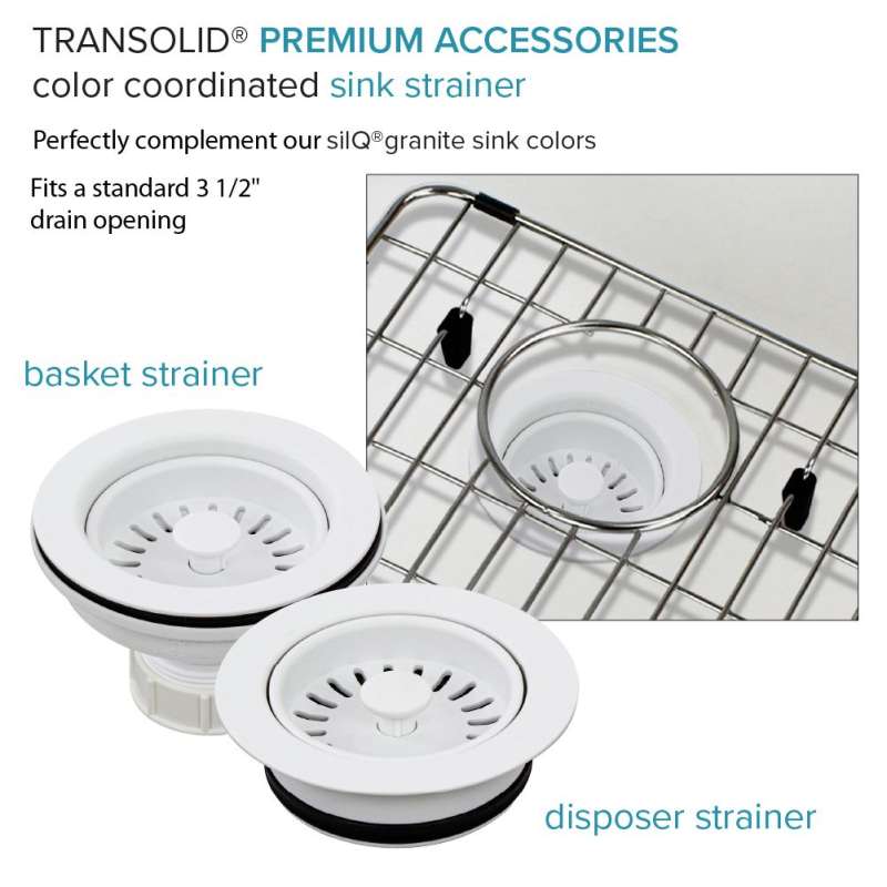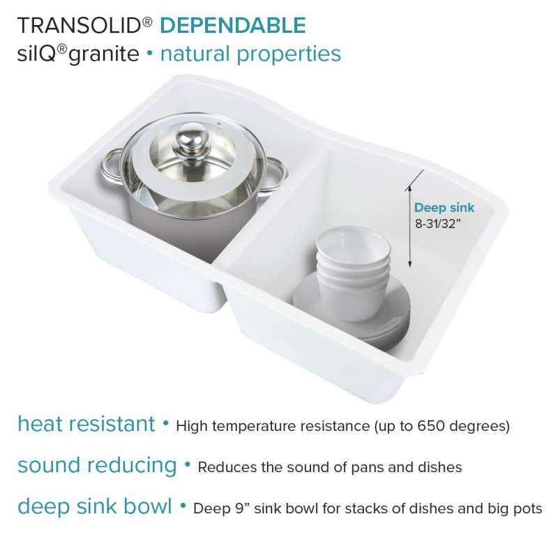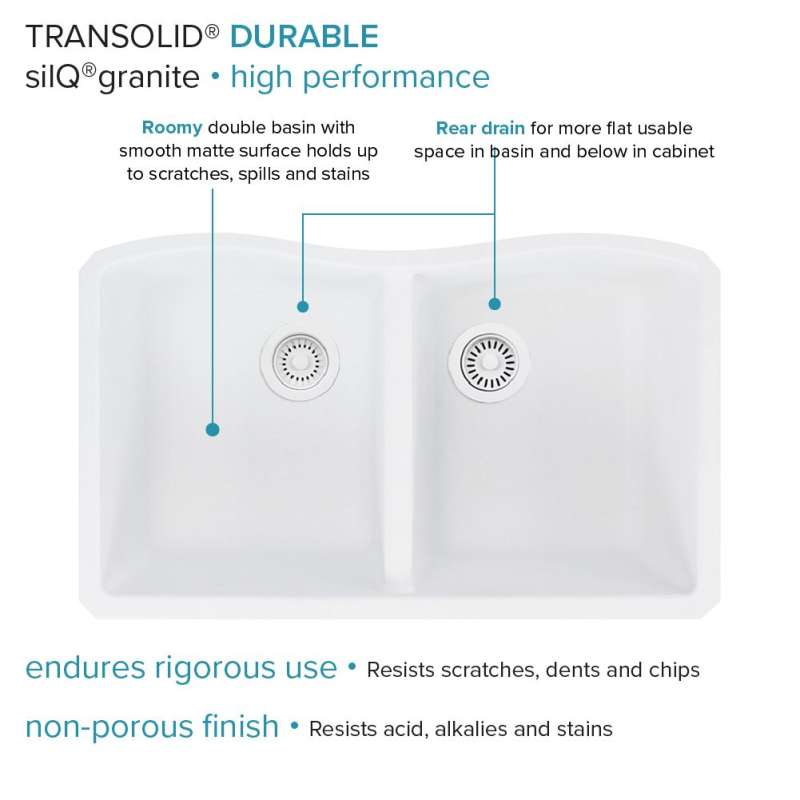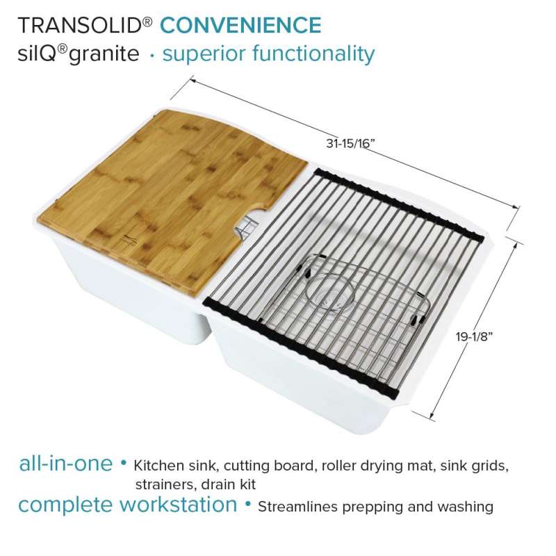 Transolid silQ® granite sinks are made with the union of natural granite and acrylic resin. The result gives Transolid sinks resistance to high temperatures, scratches, dents and chips, as well as impacts and violent shocks. The non-porous 100% food-safe surface grants you peace of mind and reduces the need for cleaning with harsh chemicals. Say goodbye to endless hours of shopping and say hello to pre-matched accessories that will make your sink the perfect multi-functional workspace. Covered by Transolid's lifetime limited residential warranty.