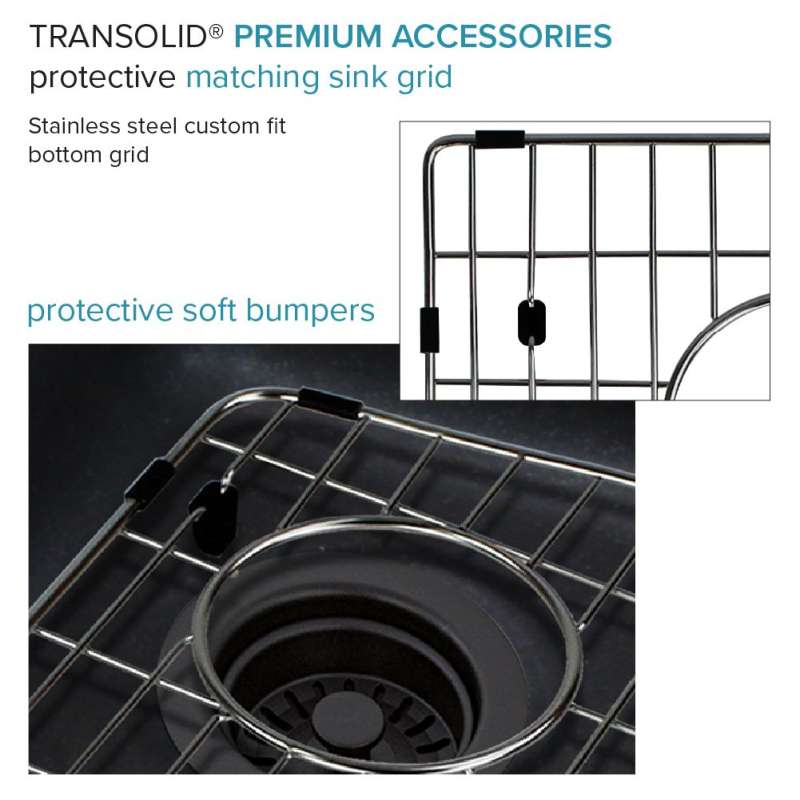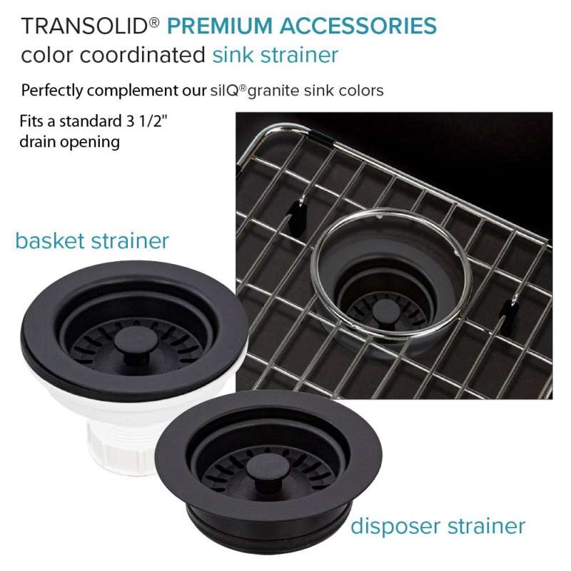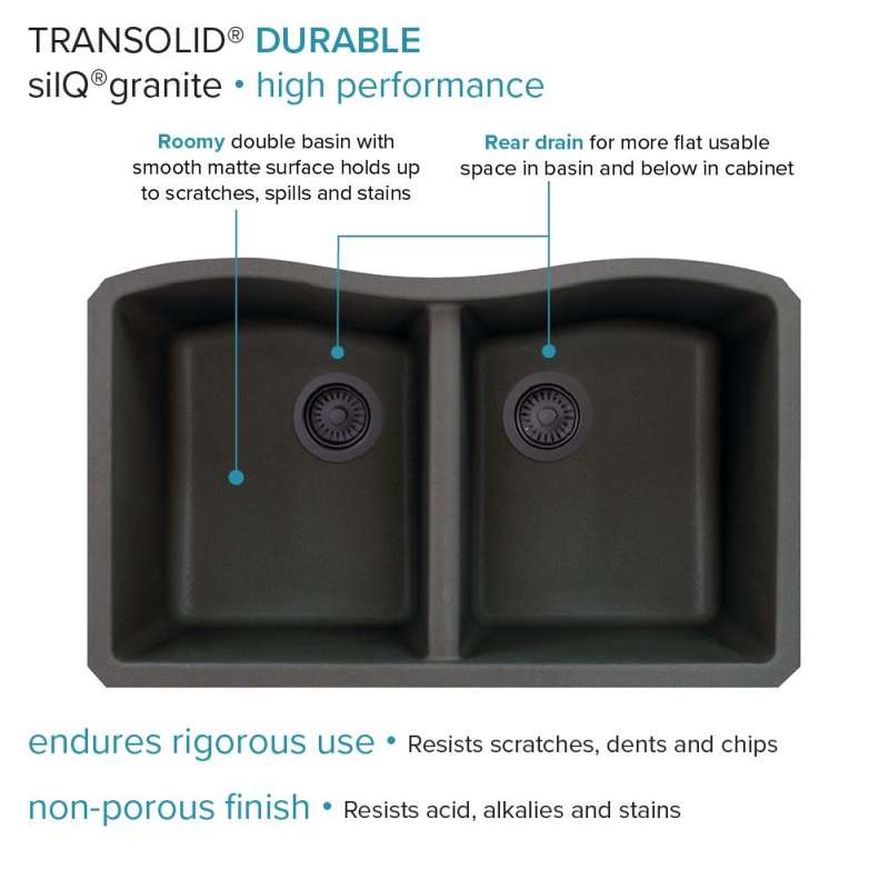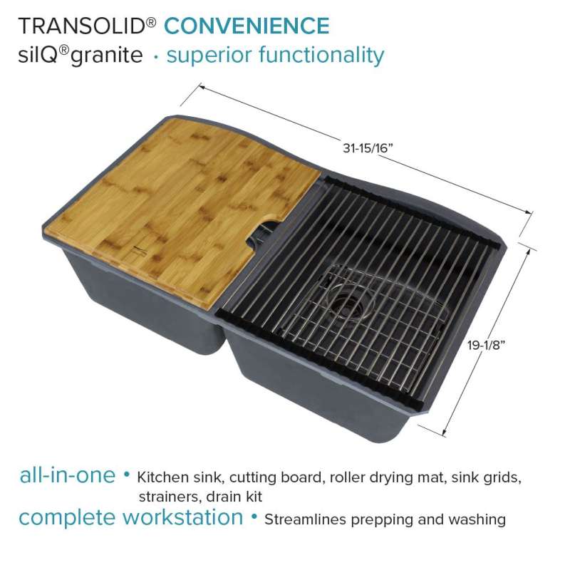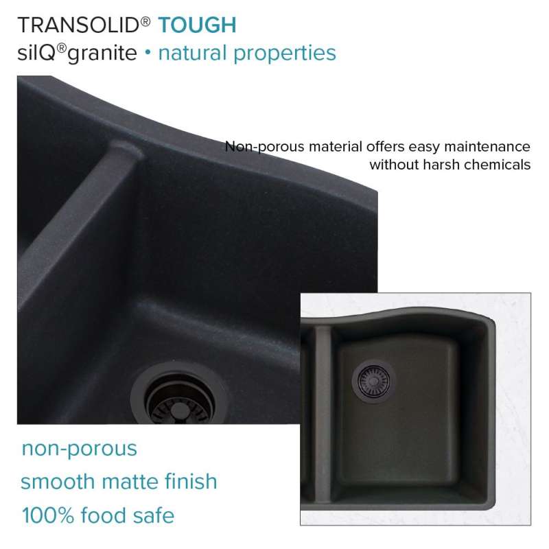 Transolid silQ® granite sinks are made with the union of natural granite and acrylic resin. The result gives Transolid sinks resistance to high temperatures, scratches, dents and chips, as well as impacts and violent shocks. The non-porous 100% food-safe surface grants you peace of mind and reduces the need for cleaning with harsh chemicals. Say goodbye to endless hours of shopping and say hello to pre-matched accessories that will make your sink the perfect multi-functional workspace. Covered by Transolid's lifetime limited residential warranty.